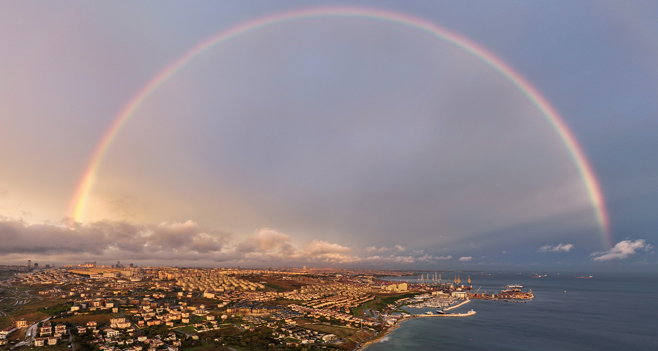 İstanbul’da etkili olan sağanak yağış sonrası gün batımında oluşan gökkuşağı Beylikdüzü semalarında havadan görüntülendi. Gökyüzünde oluşan renk cümbüşü şehrin manzarası ile birlikte vatandaşların ilgi odağı oldu. Yağmur bulutları ile birlikte oluşan gökkuşağı görenleri kendine hayran bıraktırdı. Gökkuşağı yaklaşık 20 dakika boyunca net bir şekilde gözüktü.