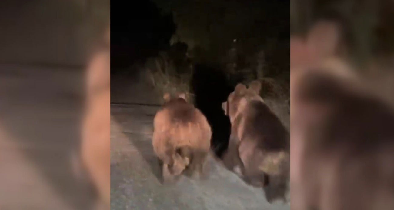 Gece otomobilin önünde koşan iki ayı cep telefonuyla görüntülendi