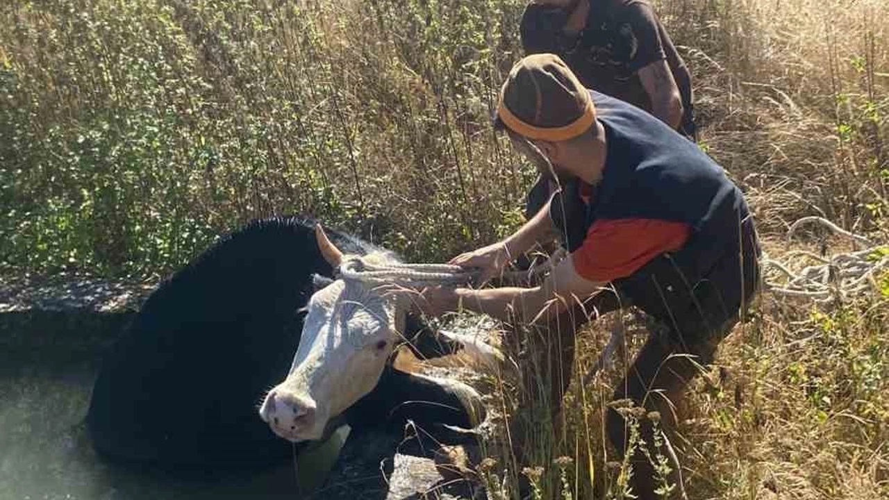 Hatayda kuyuya düşen buzağıyı itfaiye ekipleri kurtardı
